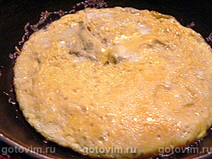 Вылейте яйца в небольшую, предварительно разогретую с 1 ст.л. масла сковороду. Пожарьте омлет под крышкой и остудите.