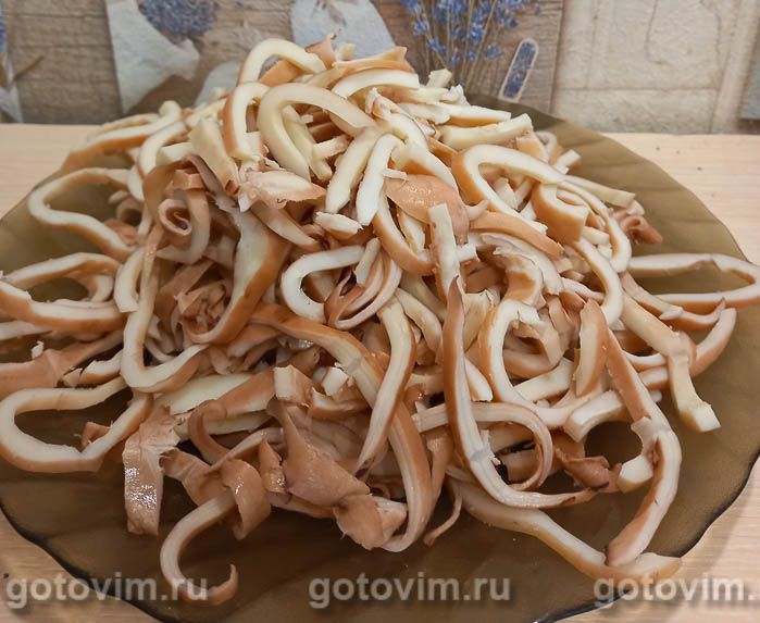 Кальмар нарезать соломкой.