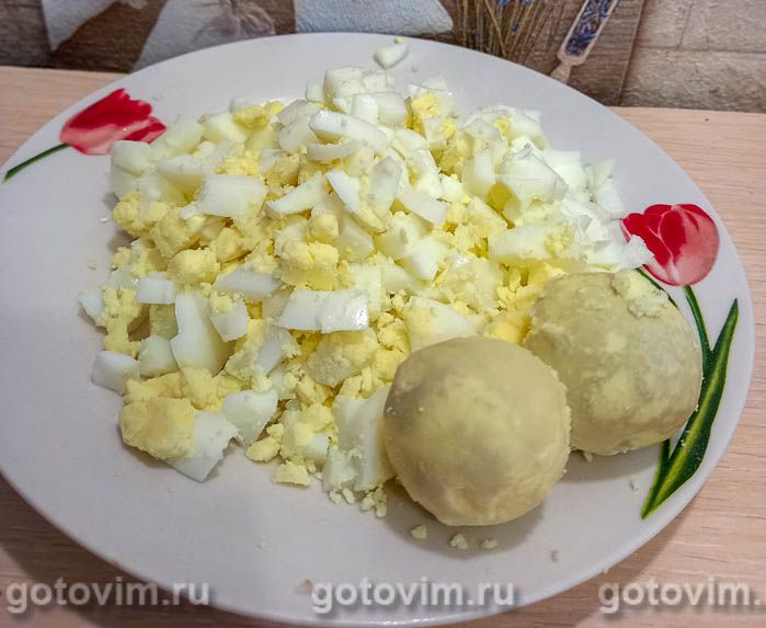 Яйца нарезать небольшими кубиками. Оставить целыми 1,5 желтка, которые понадобятся для оформления салата.