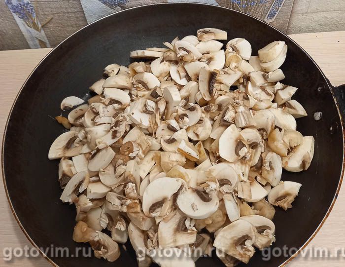 Шампиньоны промыть, порезать на кусочки и поджарить до готовности на растительном масле. При жарке подсолить грибы и добавить специи. Орегано и перец можно заменить на сушеный чеснок, базилик или прованские травы.