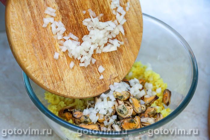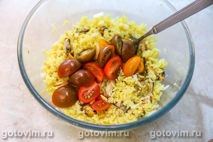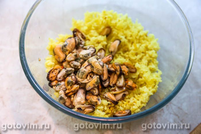 В салатике смешать вареный рис и мидии, предварительно слив с них масло.