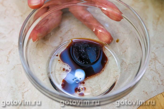 Для салатной заправки размешать венчиком или вилкой смесь из растительного масла с соевым соусом и бальзамическим уксусом.