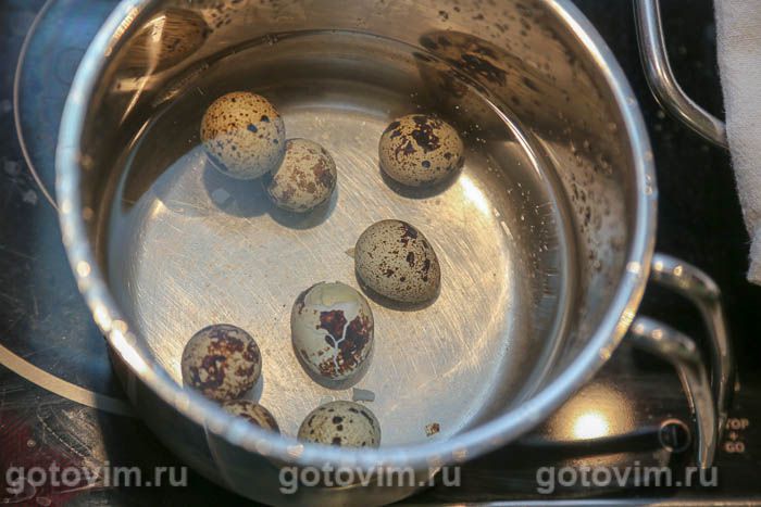 Перепелиные яйца сложить в кастрюлю, залить водой. Нагреть воду до кипения и варить 7-8 минут. Чтобы легко очистить вареные яйца перепелов ими нужно хорошо постучать по поверхности стола, затем покатать расколотое яйцо по столу и, подцепив кусочек скорлупы пальцами, потянуть за неё так, чтобы вся скорлупа снялась практически за одно — два движения.