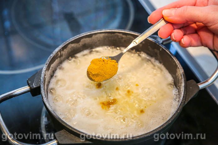 Рис промыть, залить горячей водой, посолить, добавить куркуму. Дать воде закипеть, снизить нагрев до минимума и варить до готовности примерно 10 минут. Готовый рис промыть и откинуть на металлическое сито.
