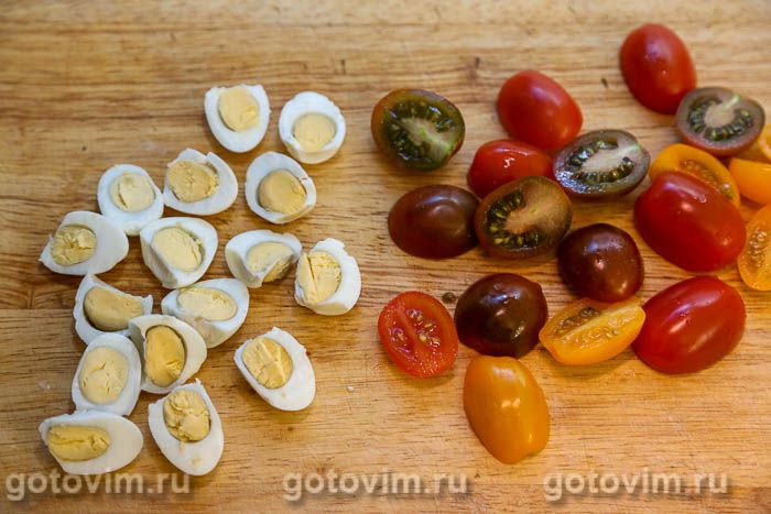 Перепелиные яйца разрезать вдоль пополам. Так же поступить с помидорами черри.