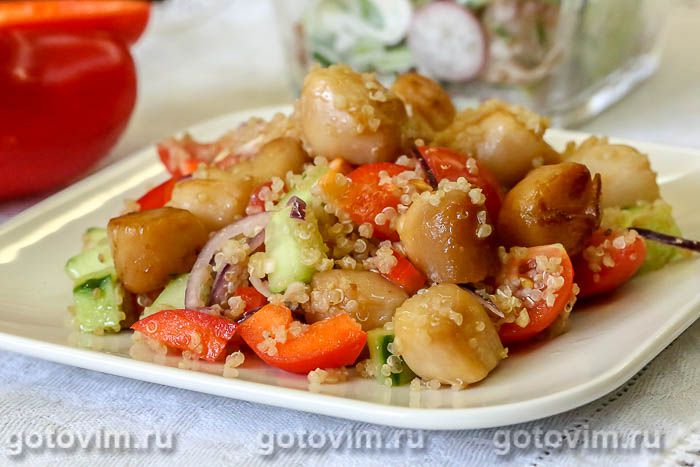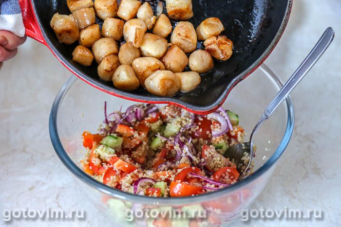 Добавить жареные гребешки и еще раз все перемешать. Салат из киноа с морскими гребешками и овощами готов. К столу подавать сразу же, пока гребешки теплые. Приятного аппетита!
