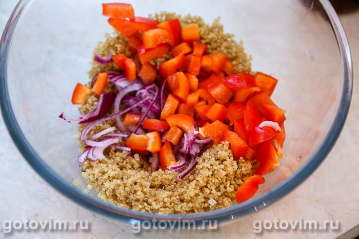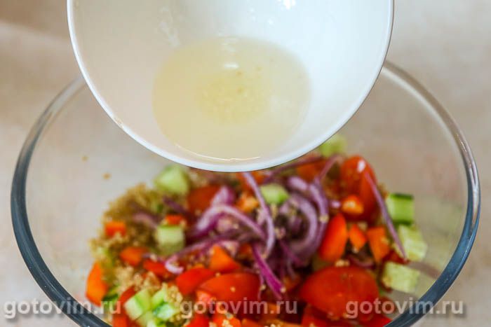 В салатнике смешать киноа и овощи. Посолить по вкусу.