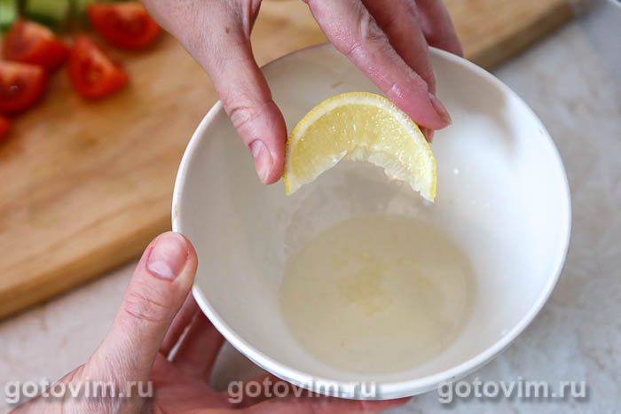 Для приготовления салатной заправки в небольшой миске смешать вилкой или венчиком растительное масло с лимонным соком и пропущенным через пресс чесноком.