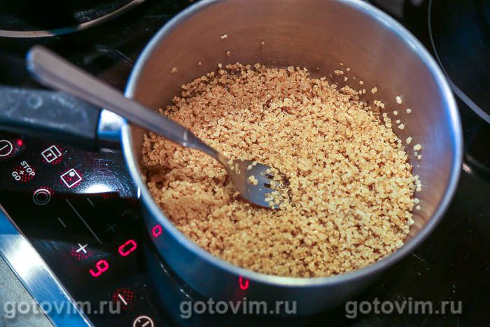 Сварить киноа для салата. Для этого крупу несколько раз промыть в холодной воде, засыпать в кастрюлю, залить холодной водой в соотношении 1:2, посолить и довести до кипения. Снизить нагрев и варить под крышкой около 15 минут. Когда зерна киноа станут полупрозрачными, снять кастрюлю с плиты. Киноа готово.