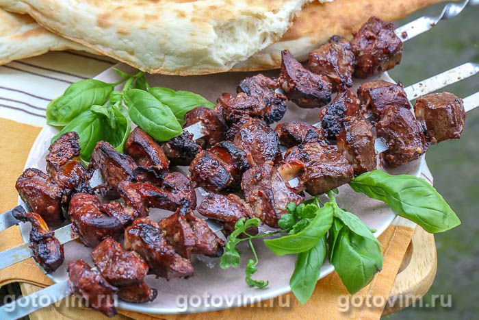 Разместить шампуры над хорошо прогоревшими углями и готовить шашлык, поворачивая шампуры, примерно 20 минут. За несколько минут до готовности, шашлыки из говяжьего сердца можно смазать смесью растопленного сливочного масла. Проверить готовность шашлыка, надрезав крайний кусочек на шампуре. Шашлык из говяжьего сердца подавать со свежей зеленью и соусом по вкусу. Приятного аппетита!