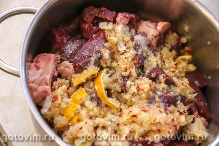 Смешать кусочки говяжьего сердца с маринадом и убрать в холодильник на ночь.