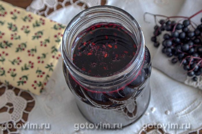 Готовим сироп из бузины 50-60 минут, пока настой не станет густым и не приобретет темный, насыщенный цвет. Разливаем сироп из черной бузины по сухим банкам и герметично закупориваем. Заготовку хранят в темном прохладном месте.