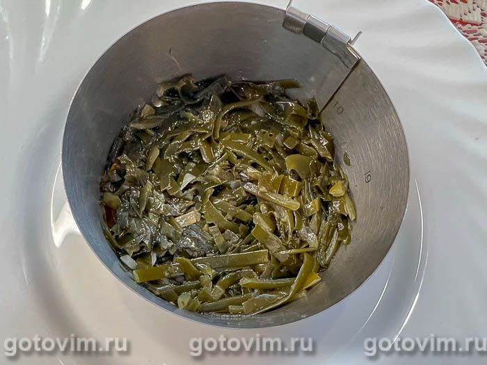 Салат удобно собирать на плоском блюде слоями, промазывая каждый слой майонезом. Сначала выложить в разъемное кольцо морскую капусту. Жидкость нужно отжать заранее. На этом этапе майонез — по желанию, так как капуста и так сочная.