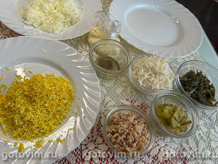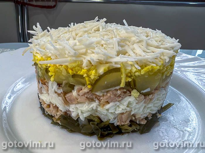Слоеный салат из куриной грудки с морской капустой и плавленым сырком