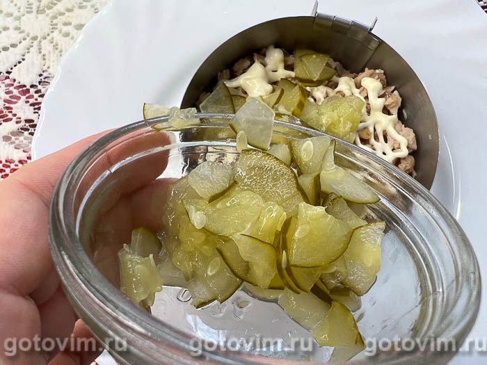 Отжать соленые огурцы. Уложить ломтики ровным слоем.
