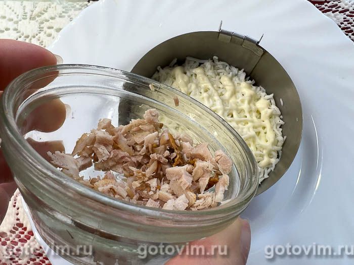 Отправить в салатное кольцо оставшееся куриное филе, распределить немного майонеза и на этот слой.