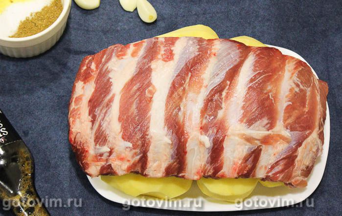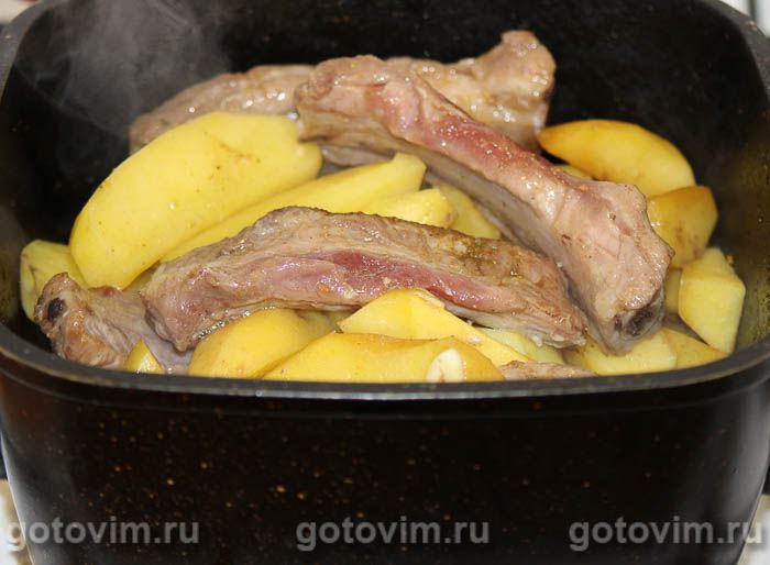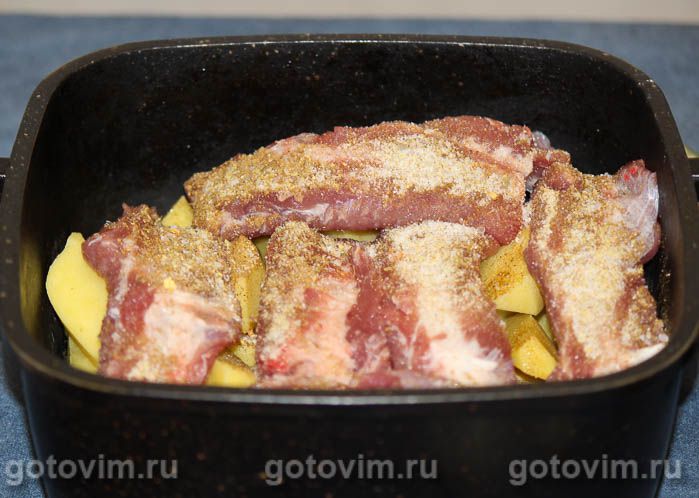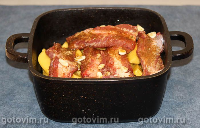 Выкладываем в казанок или гусятницу сначала картофель, затем — рёбрышки.