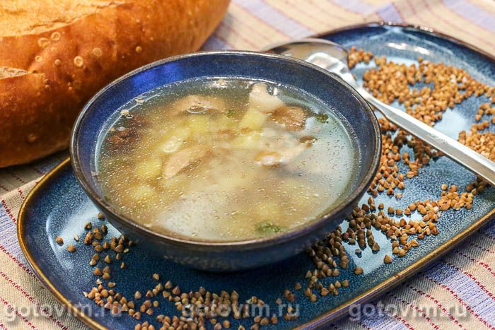 Пока варится суп, вымыть гречку, обсушить на бумажном полотенце (или пусть просто побудет на сите, чтобы вода по максимуму стекла с крупы). Насыпать на гречку на горячую сковороду (без масла). Помешивая, обжарить, до появления приятного гречневого аромата. Точнее и не скажешь, сами поймете, что гречку пора снимать с плиты.