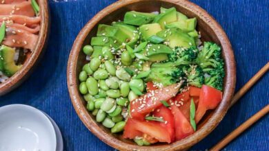 Поке-боул с бобами эдамаме, брокколи и авокадо. Рецепт с фото