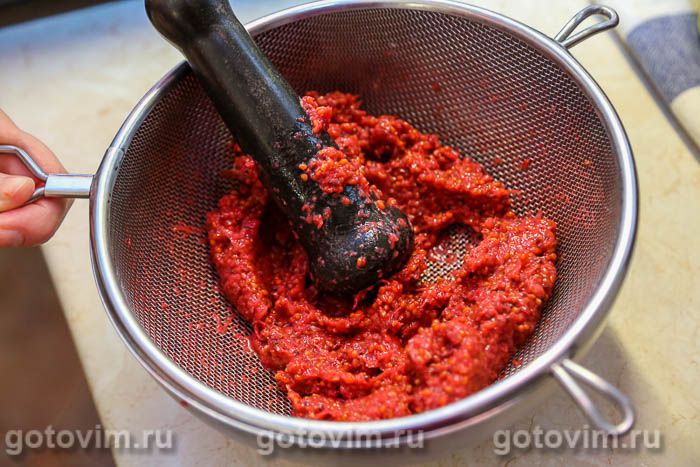 Пропаренные ягоды пересыпать вместе с жидкостью на сито, установленное над кастрюлей. Протереть смородину через сито, собрать ягодное пюре