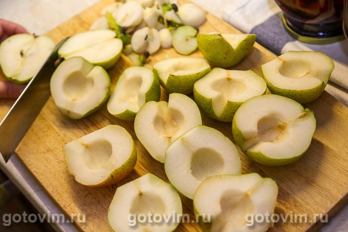 Груши вымыть, разрезать пополам и удалить семенные коробочки. Затем каждую половинку нарезать тонкими ломтиками.