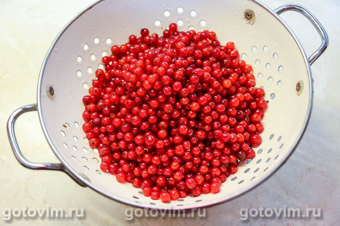Сначала надо сварить желе из красной смородины. Ягоды отделить от веточек, промыть в холодной проточной воде и откинуть на дуршлаг.