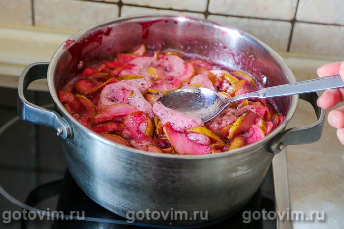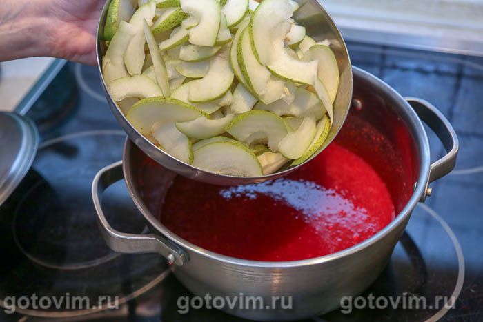 Отправить нарезанную грушу в посуду со смородиновым пюре и поставить на плиту.