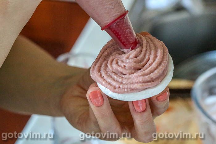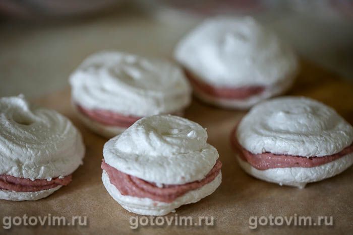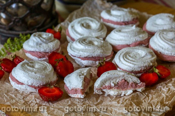 На половину безешек отсадить готовый клубничный крем и прикрыть второй безешкой.