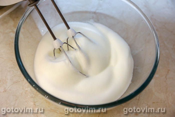 Итак, крем уже стоит в холодильнике. А мы достаем из холодильника яйца и отделяем белки. Основное правило — сахара по весу должно быть в 2 раза больше, чем белков. В среднем вес белка яйца категории С1-С0 около 40г. Поэтому и пишу в рецепте, что надо взять 2 яйца. Если у вас белки оказались тяжелее или легче, то корректируйте норму сахара. Взбиваем белки миксера 1-2 минуты, чтобы масса стала воздушной и заметно увеличилась в объеме.