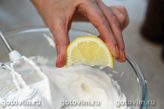 Добавляем щепотку сахара, а затем — лимонный сок. Белковая масса, взбитая до устойчивых пиков, готова к выпечке безе.