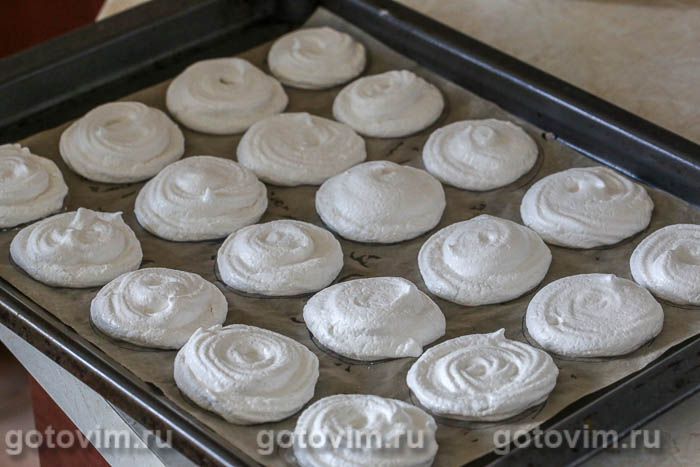 Духовка уже прогрета примерно до 100-110С. Ставим противень с безе и выпекаем 1 час 20 минут (или чуть больше). Ориентируйтесь на свою духовку. Готовое безе должно быть твердым и хрупким снаружи, и оставаться мягким внутри.