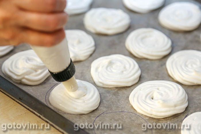 Переворачиваем лист, чтобы нарисованная сторона оказалась снизу, а белковую массу отсаживаем из корнетика с насадкой на просвечивающийся рисунок.