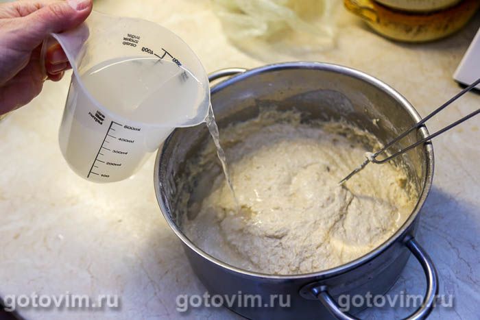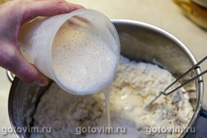 Влить кефир, продолжая размешать венчиком или миксером, чтобы не осталось комочков. Добавить сахар и соль.