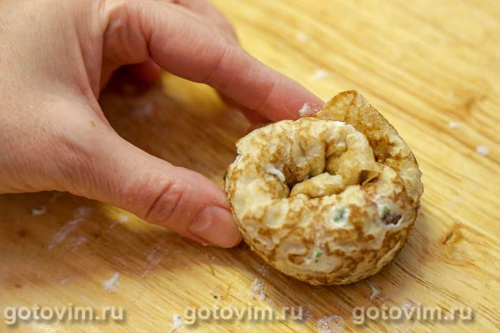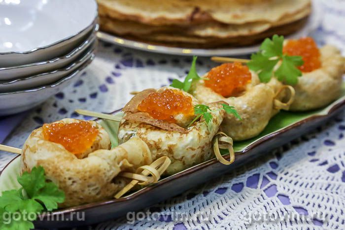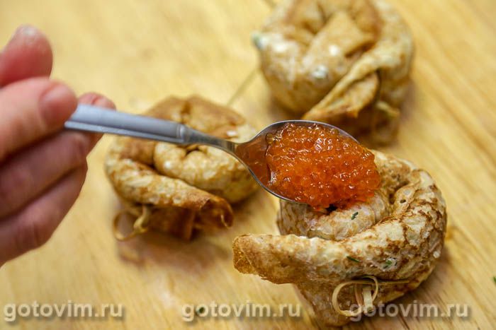 а затем скрутить блинную трубочку улиткой, как показано на фото. Закрепить кончик блина деревянной зубочисткой.