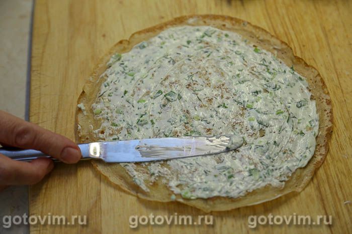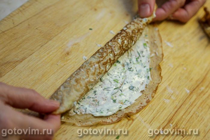 Каждый блинчик смазать начинкой.