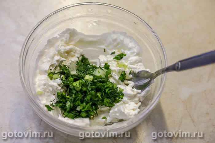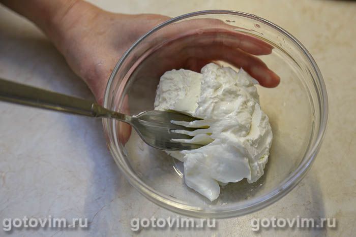 Приготовить начинку. Каймак размять вилкой. Если нет каймака, берите творожный сыр.