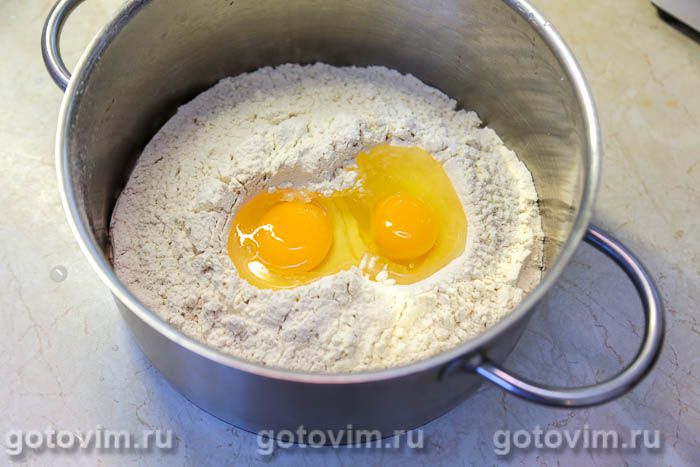 В миску просеять муку, выбить яйца, растереть венчиком.
