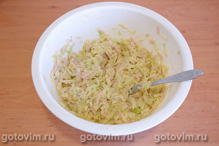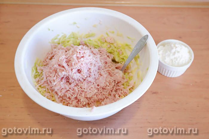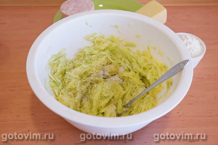 Натереть на терке сыр и колбасу, добавить к кабачкам, перемешать.