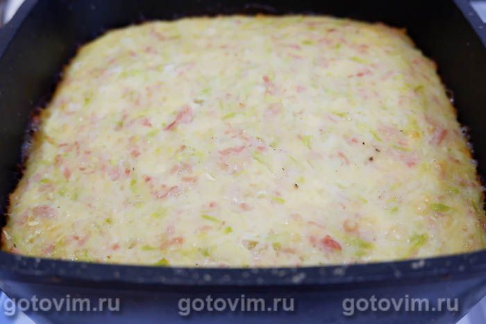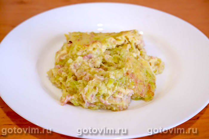 Эта запеканка из кабачков напоминает пирог. Причем «кабачковое тесто» дополнено колбасой, которую мелко нарезают или натирают на крупной терке. Вместо вареной колбасы можно взять ветчину или любое копченое мясо. Запеканка из перечисленных в рецепте продуктов будет готова примерно за 1 час.