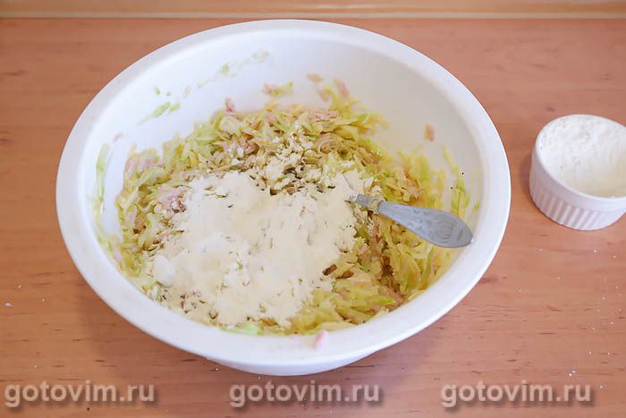 Продолжая перемешивать ложкой, понемногу подсыпать муку.