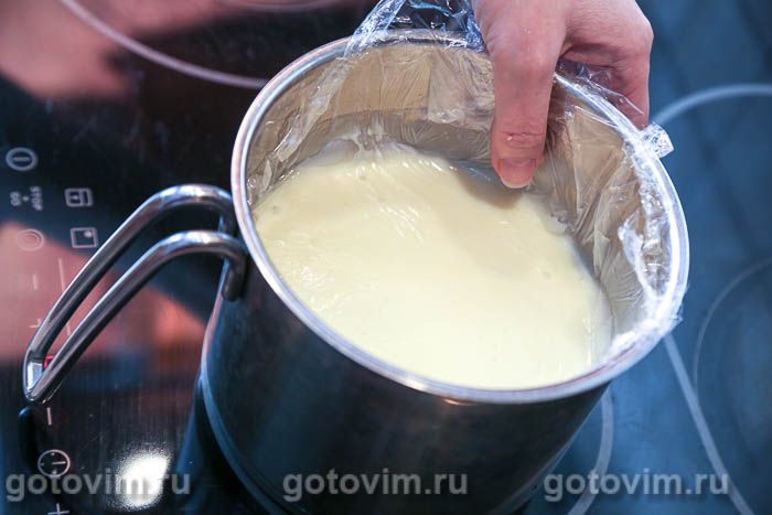 Затянуть посуду пищевой пленкой, чтобы пленка вплотную прилегала к слою заварного крема. Дать крему остыть сначала при комнатной температуре, а затем можно поставить в холодильник.