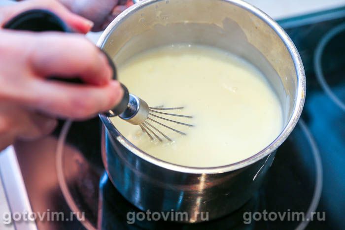 и поставить на плиту. Размешивая, чтобы крем не пригорал, варить на слабом огне до появления первых бульков.