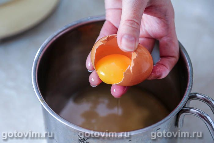 В ковш или кастрюлю подходящего объема растереть венчиком или миксером яйца с сахаром.